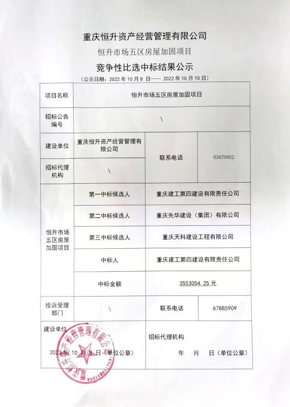 结果公示:重庆恒升资产经营管理有限公司 恒升市场五区房屋加固项目 竞争性比选中标结果公示