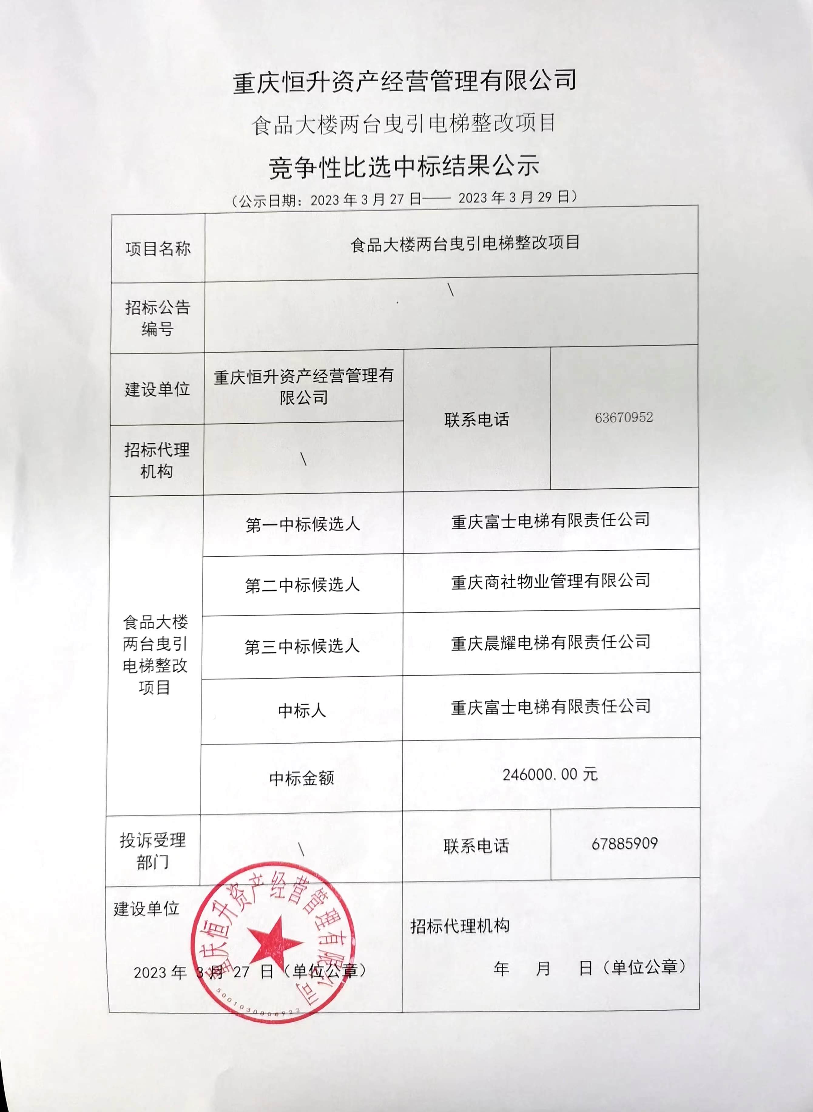 结果公示:重庆恒升资产经营管理有限公司 食品大楼两台曳引驱动电梯整改项目竞争性比选中标结果公示