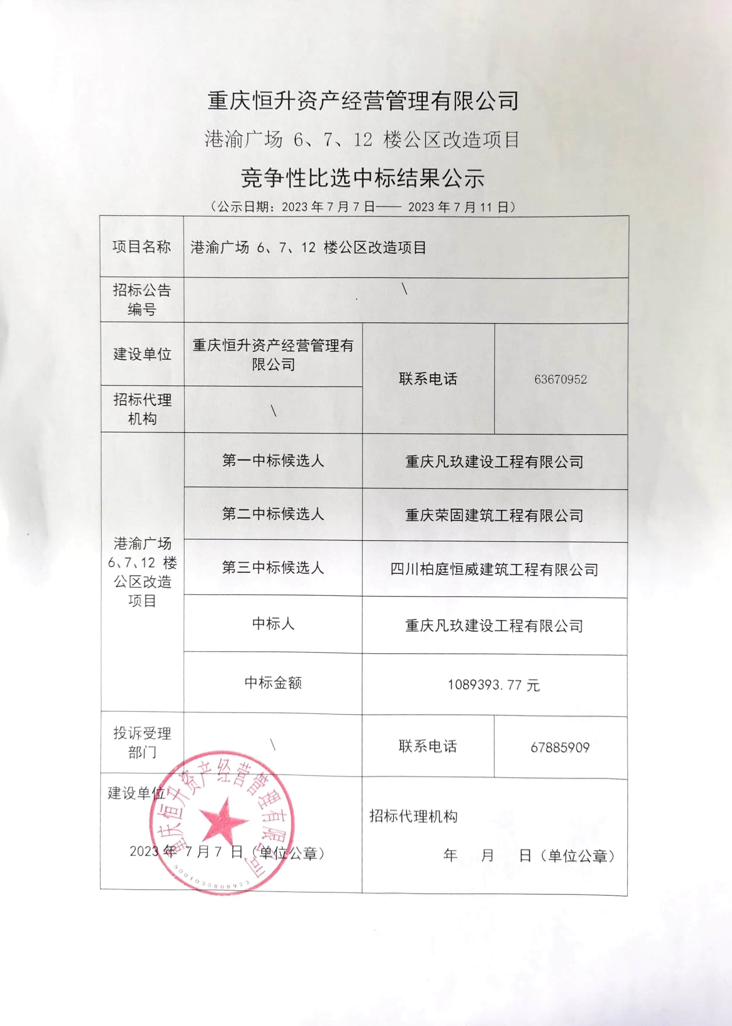 结果公示:重庆恒升资产经营管理有限公司 港渝广场 6、7、12 楼公区改造项目 竞争性比选中标结果公示