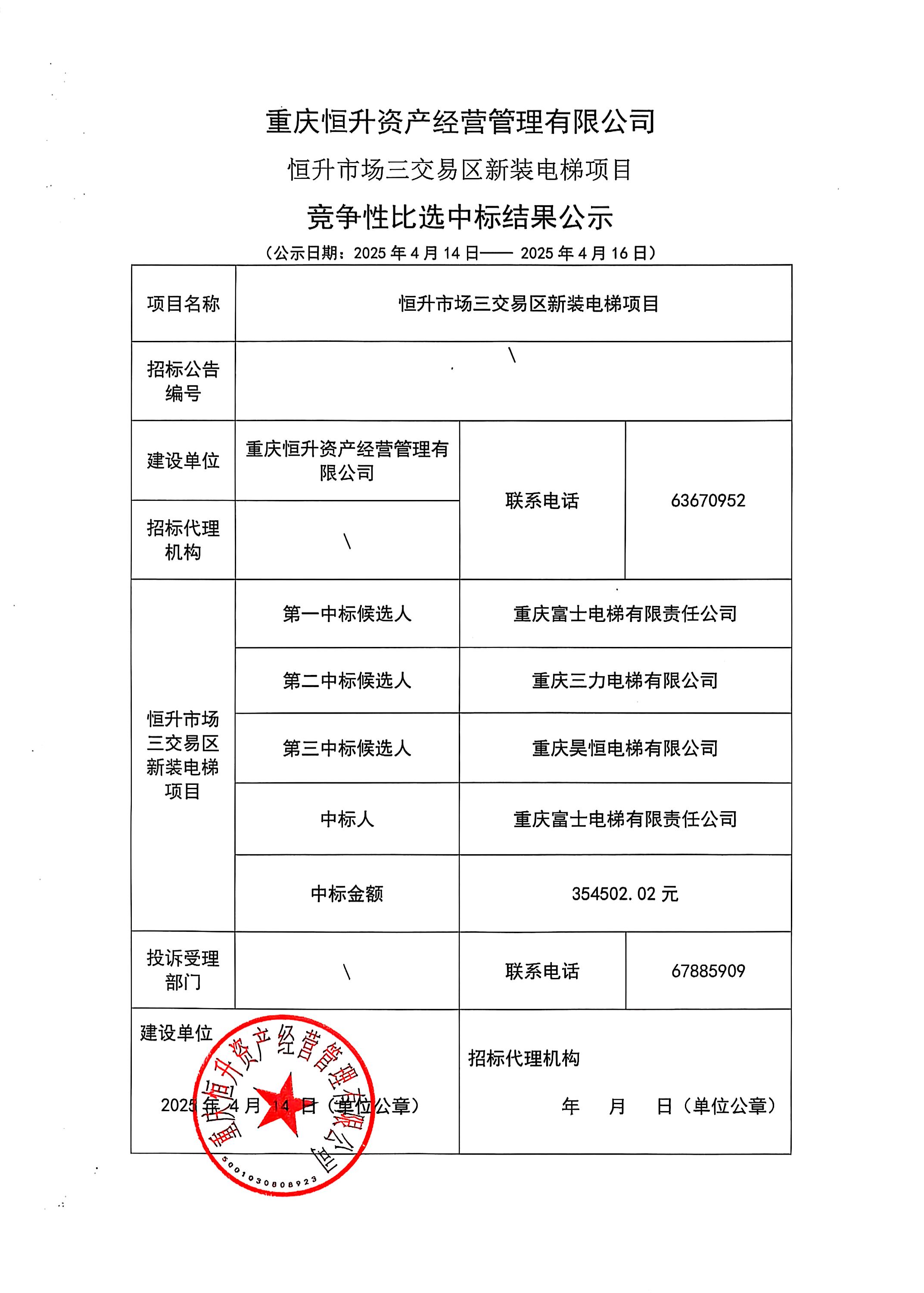 结果公示:重庆恒升资产经营管理有限公司 恒升市场三交易区新装电梯项目竞争性比选中标结果公示